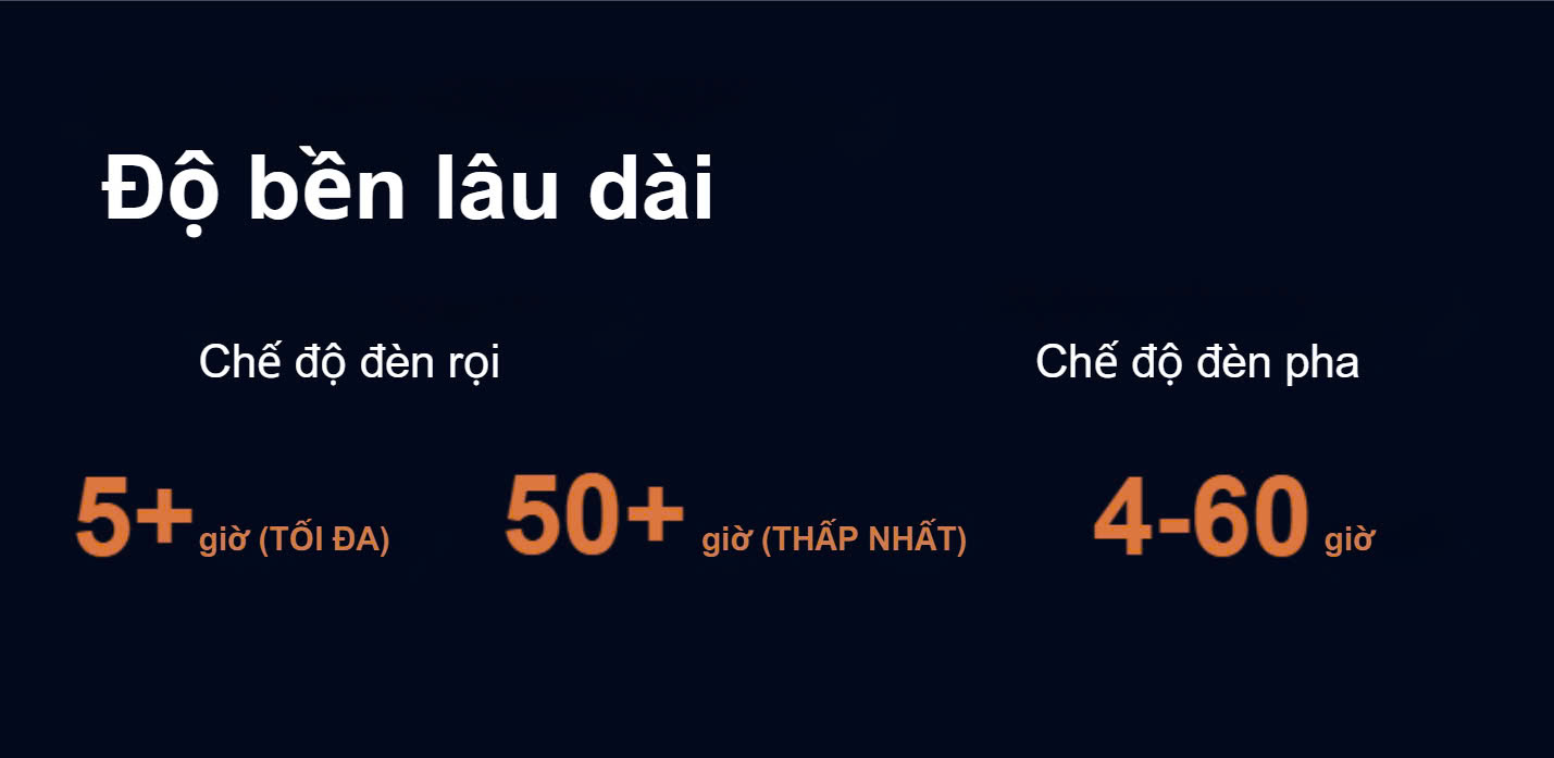 Sản phẩm được thiết kế tối ưu với pin dung lượng cao để đảm bảo chiếu sáng lâu dài. Khi đi cắm trại, trường hợp khẩn cấp sửa chữa hoặc làm việc dài, người dùng có thể tin tưởng vào sản phẩm này để có ánh sáng đáng tin cậy, lâu dài mà không cần phải sạc lại hoặc thay pin thường xuyên