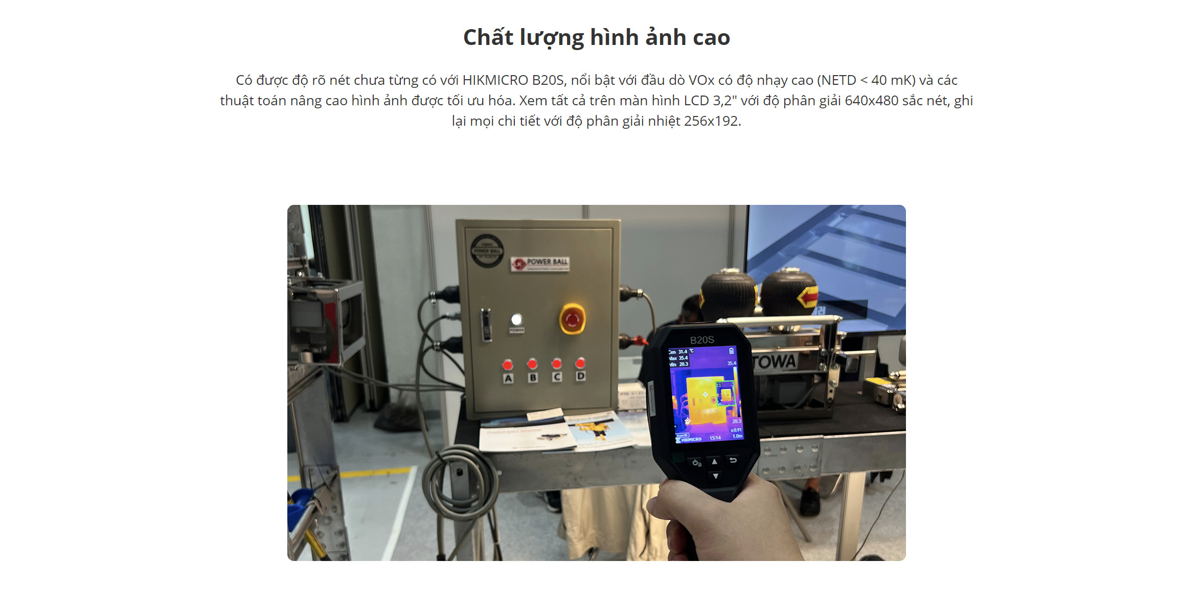 Một trong những tính năng nổi bật của Hikmicro B20S là độ phân giải hình ảnh nhiệt lên đến 640 x 480 pixels, cho phép ghi lại hình ảnh nhiệt với độ chi tiết cao. Điều này đặc biệt hữu ích trong việc phát hiện các điểm nóng hoặc các khu vực có vấn đề nhiệt độ trong các hệ thống điện, cơ khí hay xây dựng. Bên cạnh đó, thiết bị còn có dải đo nhiệt độ rộng từ -20°C đến 550°C, giúp người dùng có thể sử dụng trong nhiều ứng dụng khác nhau, từ kiểm tra hệ thống điện, kiểm tra nhiệt độ tòa nhà đến kiểm tra các thiết bị công nghiệp.