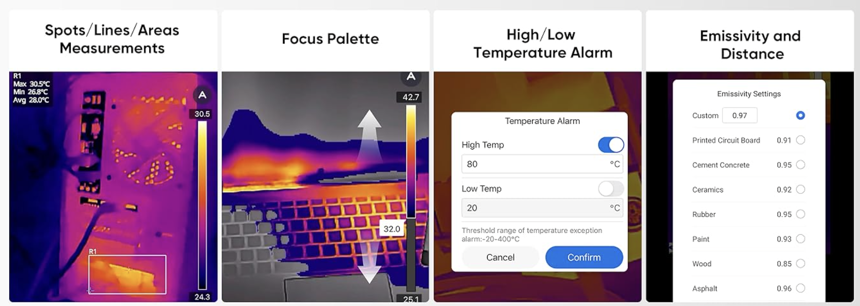 - Đọc nhiệt độ chính xác: Mini2Plus V2 có thể phát hiện sự chênh lệch nhiệt độ nhỏ tới 0,04℃ và cung cấp các phép đo chính xác với độ chính xác ấn tượng lên tới ±2℃/±3,6℉. Bằng cách điều chỉnh độ phát xạ và khoảng cách của vật thể, bạn có thể đạt được hoạt động chuyên nghiệp và nâng cao độ chính xác của các phép đo nhiệt độ.