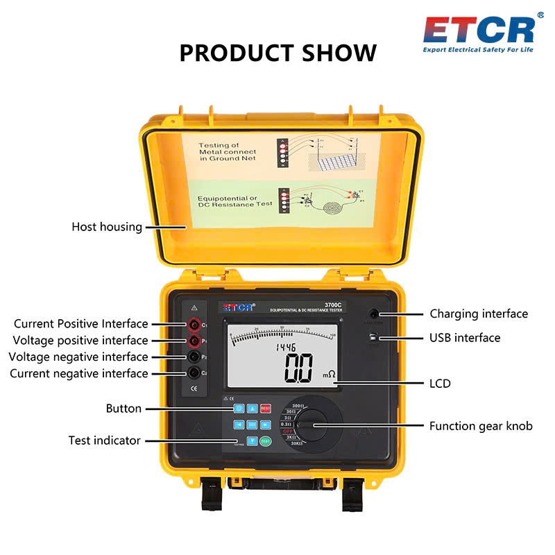 Máy kiểm tra điện trở liên kết đẳng thế ETCR3700C, còn được gọi là Máy kiểm tra điện trở thấp DC, được sử dụng để đo điện trở liên kết đẳng thế trong các công trình xây dựng và các thành phần kim loại (đai sét, dầm cấp, kết cấu, bảo vệ, thanh sàn, ống nước, bộ tản nhiệt, nhà vệ sinh, cửa ra vào và cửa sổ, ban công, nhà bếp và các vật thể khác), cũng có thể đo điện trở tiếp xúc của máy cắt mạch, tiếp điểm công tắc và ổ cắm cũng như nhiều loại điện trở cuộn dây, điện trở bộ chuyển hướng và điện trở tán đinh kim loại cho xe cộ, tàu thuyền và máy bay, điện trở của các tiếp điểm hàn, điện trở kết nối song song của ắc quy lưu trữ, điện trở tiếp xúc của thanh phân phối (thanh) và dây, v.v. Thiết bị được trang bị bộ pin lithium dung lượng lớn, đặc biệt để sử dụng tại công trường xây dựng ngoài trời. Nó được sử dụng rộng rãi trong trạm kiểm tra chất lượng xây dựng, công ty giám sát, đơn vị xây dựng, công ty chống sét, bộ phận điện lực và nhà máy đầu máy tàu thủy, v.v. Máy kiểm tra điện trở liên kết đẳng thế ETCR3700C bao gồm máy chủ, phần mềm giám sát, dây dẫn thử nghiệm, bộ sạc và dây giao tiếp USB. Thiết bị áp dụng phương pháp bốn dây chính xác để kiểm tra, chính xác và đáng tin cậy. Nó cũng có các chức năng của chức năng báo động, chức năng đồng hồ và chiều dài dây thử nghiệm. Máy chủ có màn hình LCD lớn. đèn nền, chỉ báo biểu đồ thanh, rõ ràng và dễ thấy, nó có thể lưu trữ 400 nhóm dữ liệu cùng một lúc. Phần mềm giám sát có các chức năng như đọc, xem lại, lưu, báo cáo và in dữ liệu lịch sử.