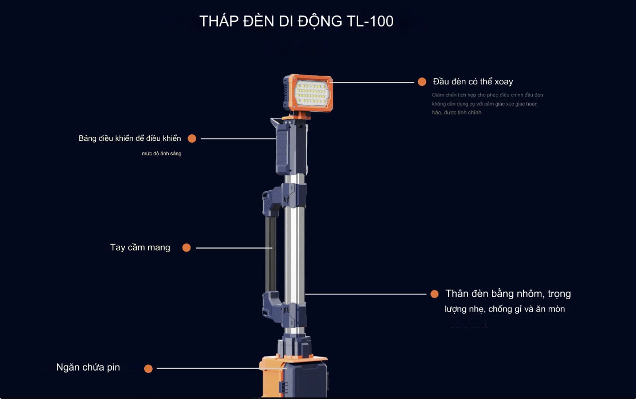 Tháp đèn di động TL-100 có hệ thống giảm chấn tích hợp cho phép điều chỉnh đầu đèn không cần dụng cụ, mang lại cảm giác chạm mịn và tinh chỉnh. Tháp đèn đa năng này được thiết kế để thích ứng với nhiều ứng dụng khác nhau, khiến nó trở thành lựa chọn lý tưởng cho các nhu cầu chiếu sáng khác nhau.